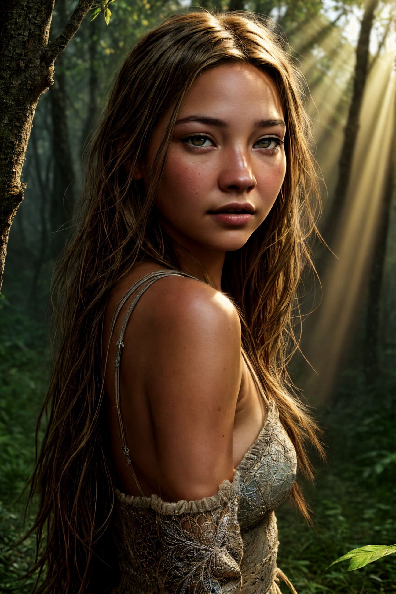 Madelyn_Cline, beautiful girl explorer, portrait, tanned skin, top view, amber eyes, rugged dress, soft colors, forest, leaves, anime style, sunlight, sunbeams, messy hair, very thin lines, handy lines, advertise pigment pen style, magical, rough, rough shading, stylize 1000, line art, dirty, big eyes, reflective eyes, perfects eyes, Gritty Realism, glowing eyes, intricate detailed, fantasy, concept art, digital art, intricate, oil on canvas, masterpiece, expert, insanely detailed, 4k resolution, sunbeams, fairy tale illustration, fantasy, filigree <lora:more_details:0.25>