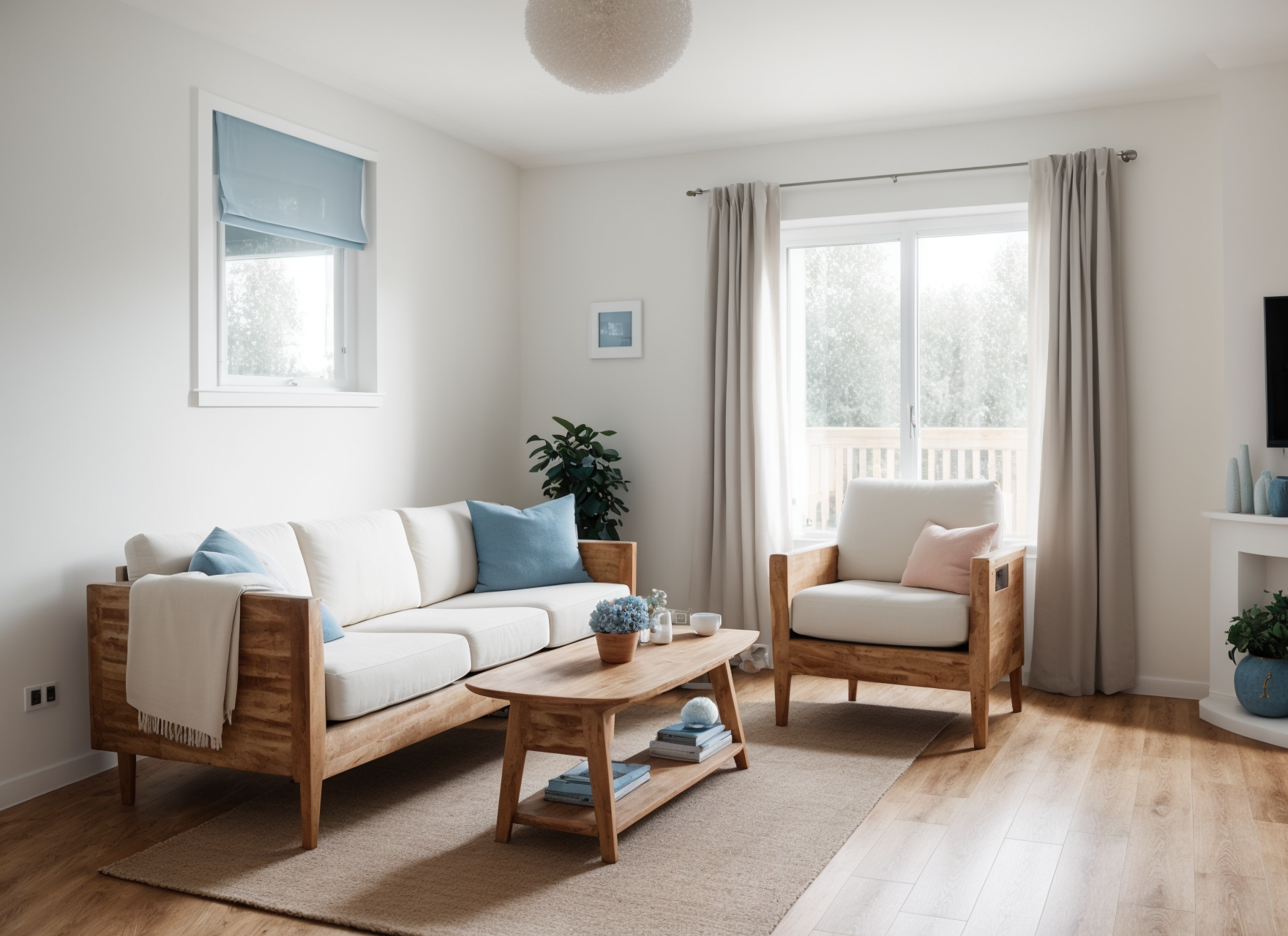 interior,living room with a white sofa and wooden floor, beige blue salmon pastel