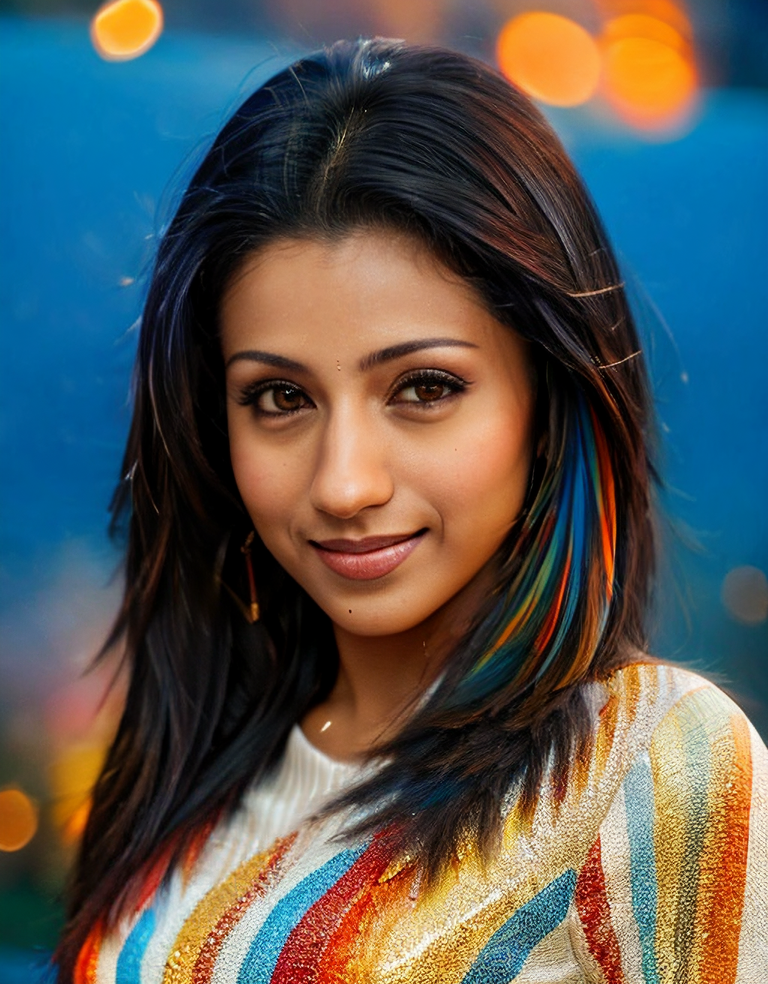 hires headshot photo of 30-year-old (trkr woman:1), ultra sharp, looking straight at camera, dynamic pose, smiling, realistic skin texture, night time, colorful bokeh lights, film grain <lora:trkr_Trisha_Krishnan_SD15_LoRA:1>