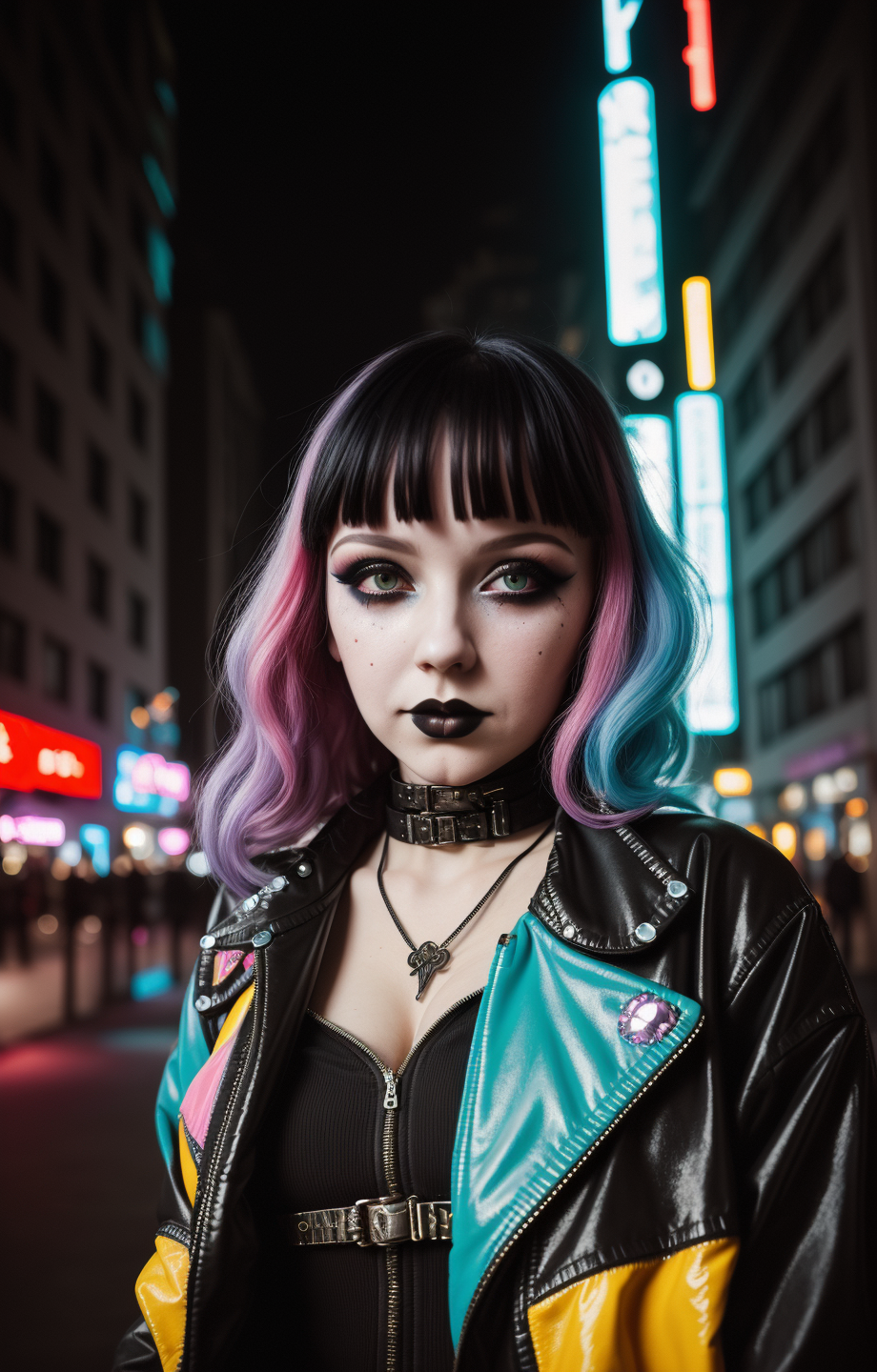 gothic girl, art deco, cute face, colorful jacket, cyberpunk street, portrait, wide angle, bokeh, UHD, HDR
