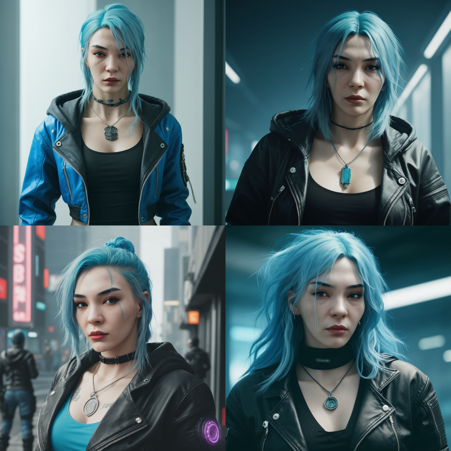 <lora:ebrusahin:1> woman, blue hair, cyberpunk thug