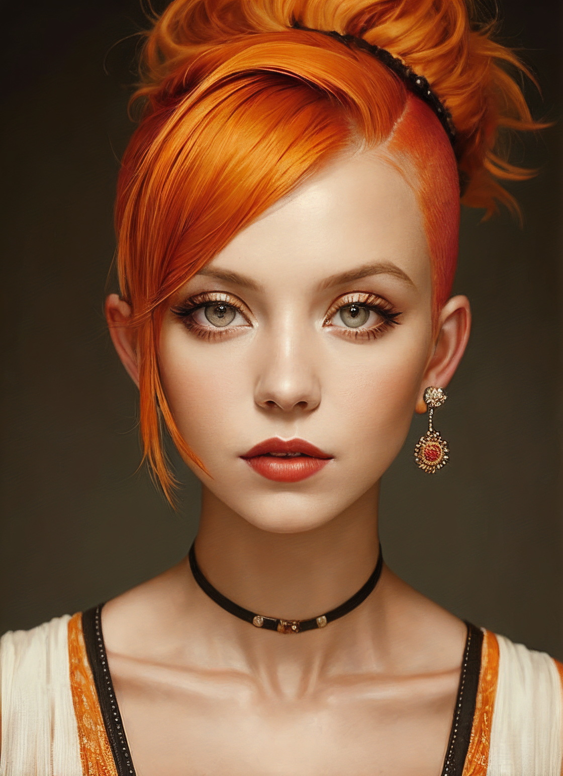 portrait of sks woman by Flora Borsi, style by Flora Borsi, bold, bright colours, orange Mohawk haircut, ((Flora Borsi)), <lora:locon_sydneysweeney_v1_from_v1_64_32:1>