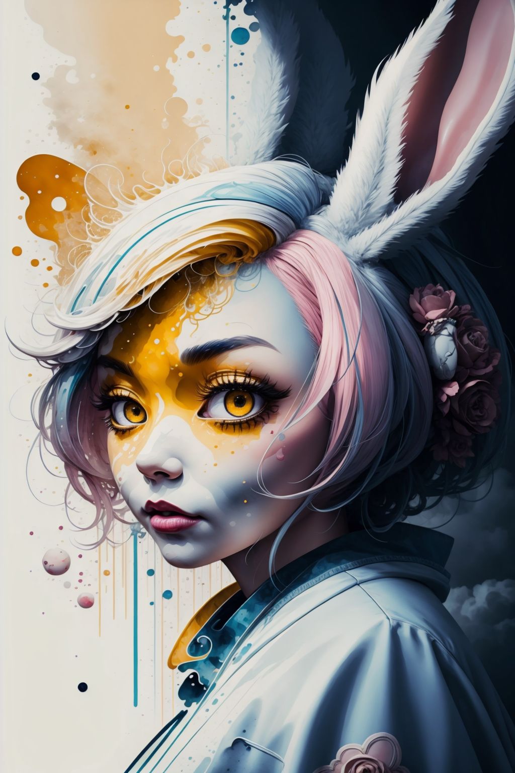 masterpiece, best quality, (rabbit) woman, large eyes, (cartoon), splashing, abstract, psychedelic, (neon:0.8), extremely detailed, (white background:1.3), ink, (creative:1.3), intricate detail, (pretty face), dynamic lighting, natural lighting, (yellow:1.3), photorealistic, sy3 <lora:Sy3:0.4> <lora:ink-0.1-3-b28-bf16-D128-A1-1-ep64-768-DAdaptation-cosine:1> ADDCOL (style of Kim Keever), fog, clouds, masterpiece, best quality, (rabbit) lady, large eyes, (cartoon), (ink, sy3:-1), (neon:0.8), extremely detailed, (creative:1.3), intricate detail, (pretty face), dynamic lighting, natural lighting, (blue), pink