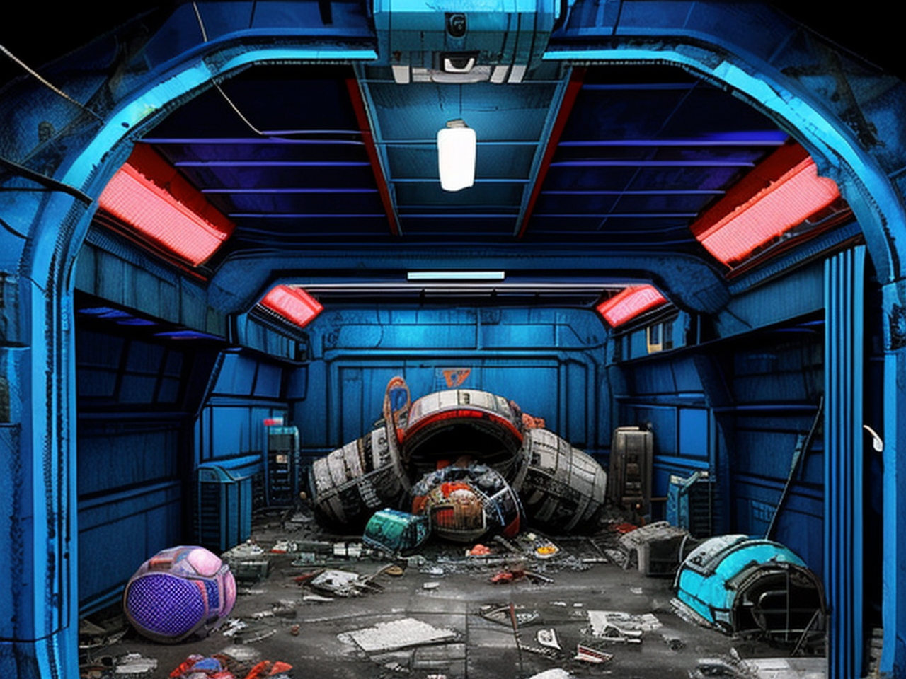 sq3junkfreighter, a warehouse with blue walls, junk, trash, rust, slime, spacecraft, dark, wires <lora:sq3egastyle:1>