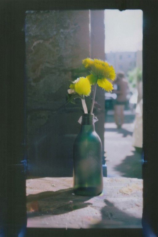 FP100C, instagram photo,a bottle with a flower, hard shadows, film grain