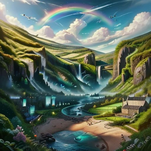 CelticLandStyle,rainbow, blue sky, cloud, tree, sky, bird, waterfall, fantasy, nature, water,<lora:CelticLandStyleAlt:1>,<lora:add_detail:0.8> ,<lora:colorfix:0.8>