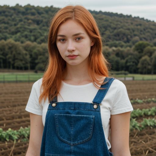 long orange hair, brown eyes, pale skin, woman, blue overalls, farm background