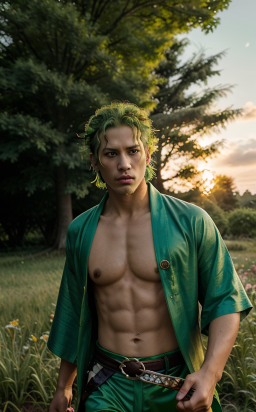 jugnle, fantasy island, a man, huge trees,roronoa zoro from one piece,Roronoa Zorro, walking, sunset, short hair, greenhair, face detail, hair detail, fantasy, dream, cinematic, depth field, flowers, tall grass, green land, happy face, human, rainbow, face detail, detailed, katana, one piece, green outfit, eye scratch, 3earrings, kimono, male kimono, 3 swords, katanas, holding a sword, one eye scratch,