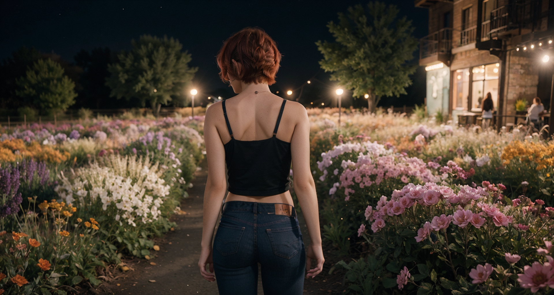 1girl, young girl, red hair, short hair, purple top, black jeans, pale skin, stand, (beautiful girl), (masterpiece), (film), (film grain), (vignette) ((movie)), (upper body), (motion blur), pink flower fields background, night, neon, orange sky, dark, from behind, ray tracing