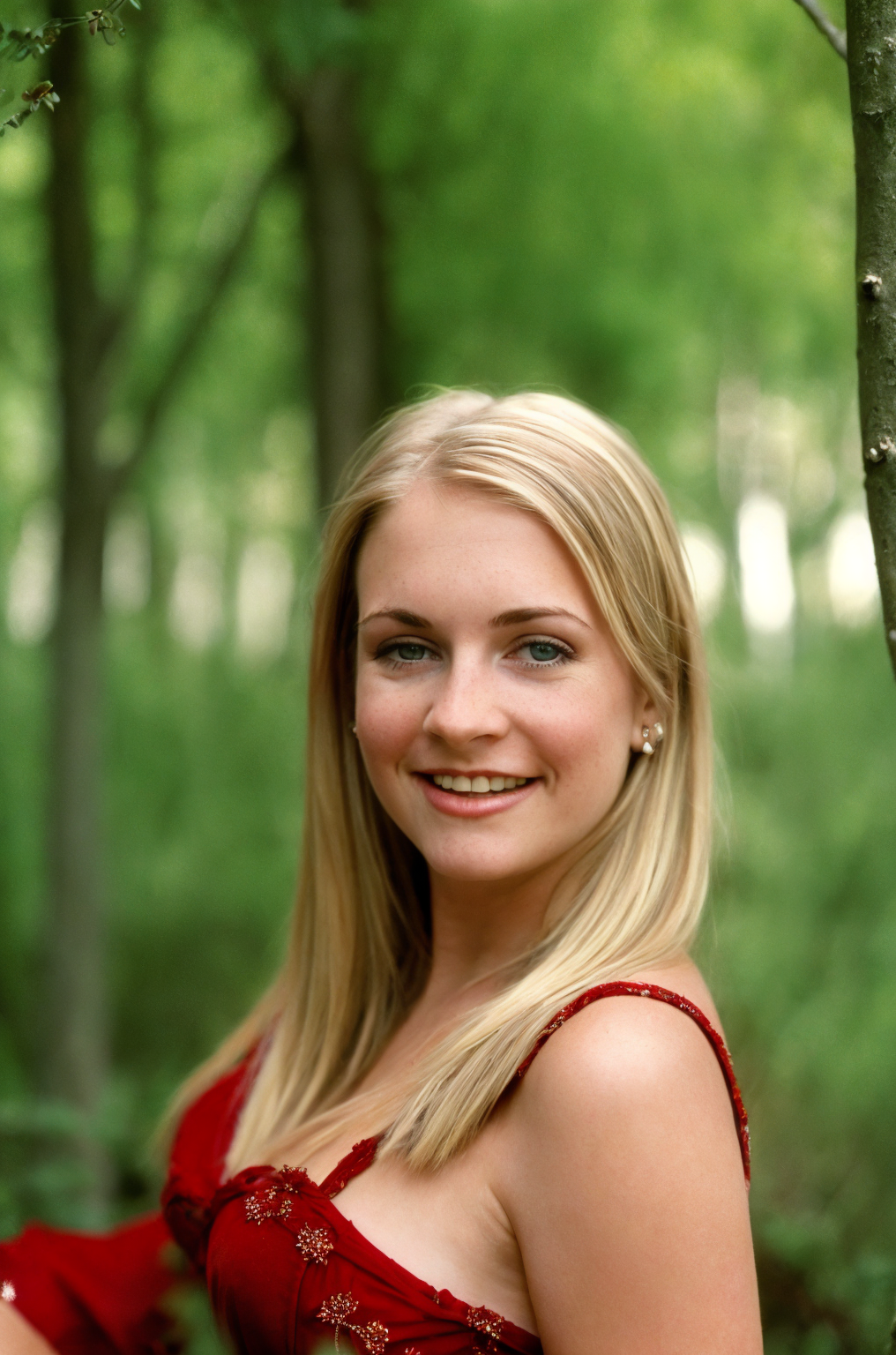 raw photo of s4brina <lora:s4brina:1>, detailed skin,blonde, detailed eyes, epiCPhoto, dslr, wears red sexy dress:1, (bokeh:1.2), cinematic, photography By David Hamilton, in the forest, cloudy day, looking at viewers, upper body, smiling, render, octane, fine art photography, pale white skin