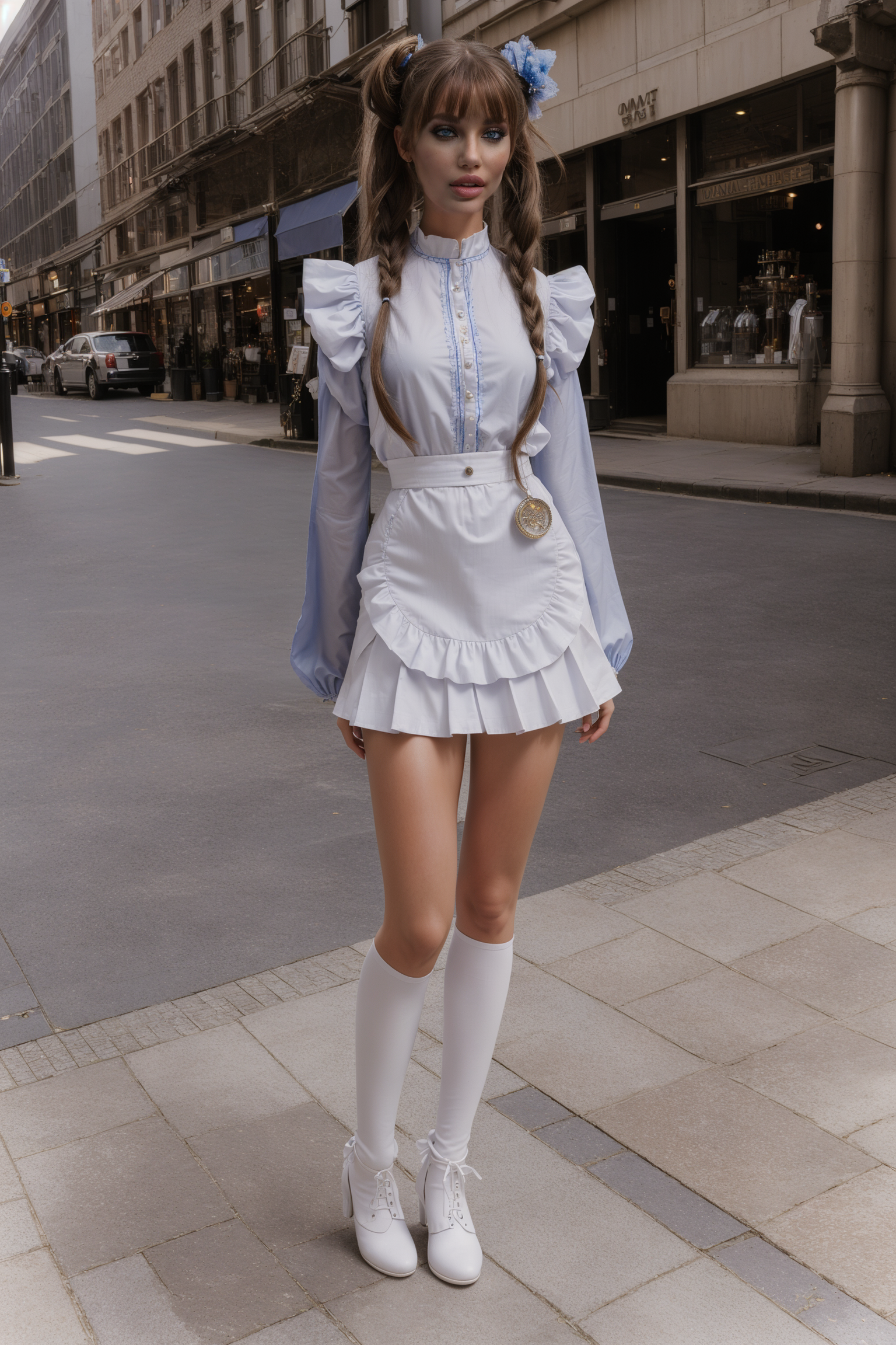 MFBP1, (full body shot:1.6), photogenic adult female, 1girl, solo, twintails, long hair, blue eyes, Twinkle,wide sleeves,apron,buttons,pleated skirt,twintails, white thighhighs, outside, nice sunny day, high details, usa, in the streets, AGGA_ST044, AGGA_ST030, AGGA_ST039, AGGA_ST028, AGGA_ST038, AGGA_ST027, standing, posing for a photo, standing pose, dynamic pose, hands on hips, (front to viewer:1.2), looking at viewer, cinemascope, detailed, 8k resolution, (masterpiece, best quality, hires, high resolution:1.2), (extremely detailed, realistic, intricate details, highres), (cinematic lighting, sunlight, volumetric), vibrant colors, blurry background, embedding:Positives\epiCRealism, , ,