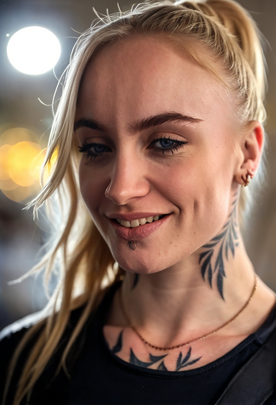 (raw photo of ohwxmo woman), (20 y.o), blonde hair, (pale white skin), (fitness girl), detailed skin, detailed eyes, epiCPhoto, amateur pic, instagram, dslr, (at the weight room:1), dslr, (wears black tight sportswear:1), neck tattoo, (muscular girl, body building:0.5), small chest, <lora:Mila-000011:0.8>, (bokeh:1.2), ponytail, (smiling:1.2), (ohwxmo woman)