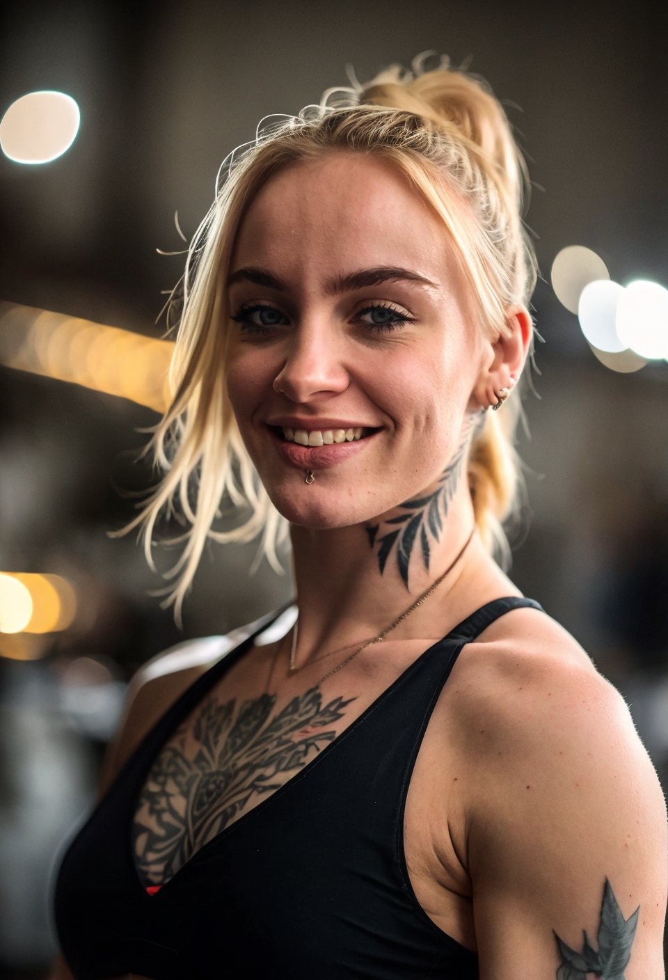 (raw photo of ohwxmo woman), (20 y.o), blonde hair, (pale white skin), (fitness girl), detailed skin, detailed eyes, epiCPhoto, amateur pic, instagram, dslr, (at the weight room:1), dslr, (wears black tight sportswear:1), neck tattoo, (muscular girl, body building:0.5), small chest, <lora:Mila-000011:0.8>, (bokeh:1.2), ponytail, (smiling:1.2), (ohwxmo:1.1)