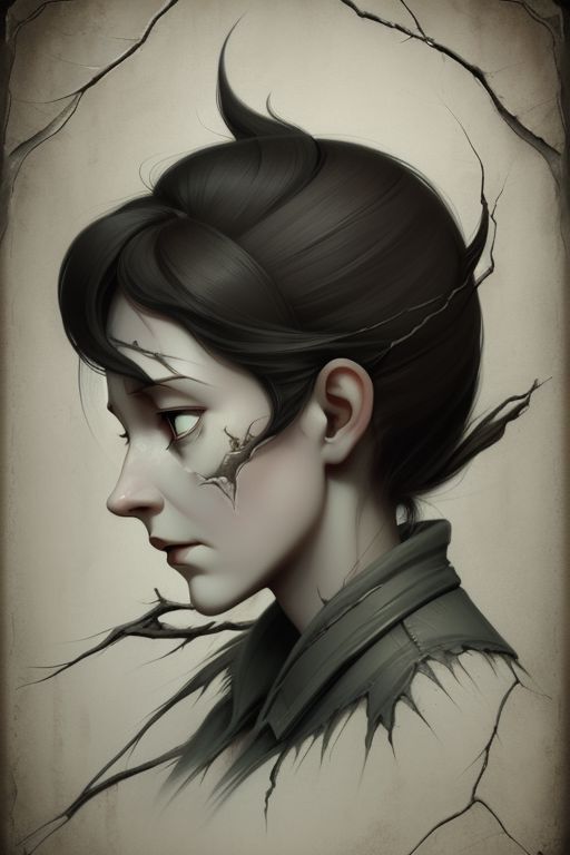 Elegant decay, poster design in the style of Anton Semenov, a side view of a woman's face with delicate cracks, her expression telling a story of hidden strength and resilience.