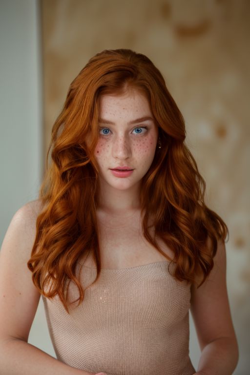 (8k, RAW photo, highest quality), beautiful girl, close up, dress, (detailed eyes:0.8), defiance512, (looking at the camera:1.4), (highest quality), (best shadow), intricate details, interior, ginger hair:1.3, dark studio, muted colors, freckles ,