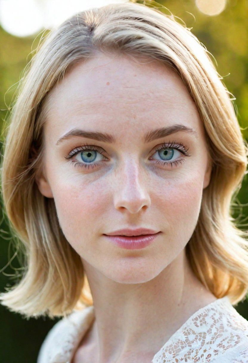 portrait of a s0phia_n0texist with fair complexion and straight, shoulder-length blonde hair, lighting is soft and natural, gentle glow on her face, subtle bokeh effect in the background, pale pink skin tone with freackles, pale blue eyes, looking the camera with neutral expression. Wears a semi-transparent white blouse, light airy feel. Natural outdoor background, muted colors, warm tones palette of her skin and the soft whites of her blouse, juxtaposed against the cooler greens and natural browns of the background. gentle and organic, with the soft roundness of her face, the straight lines of her hair, blurred background, contemplative. Her eyes are of a light hue, possibly blue or light gray, characterized by a soft, introspective gaze. They are framed by light eyelashes that appear natural and understated. There's a clarity to her eyes that stands out against her fair skin, which shows a natural complexion with subtle variations in tone. Her skin exhibits a smooth texture with a porcelain quality, almost translucent under the soft light, which accentuates her delicate features. The sunlight seems to enhance the faintest freckles across the bridge of her nose, adding character to her visage. The lighting gives her skin a luminous quality, with a gentle interplay of light and shadow that outlines her facial structure without harsh contrasts.