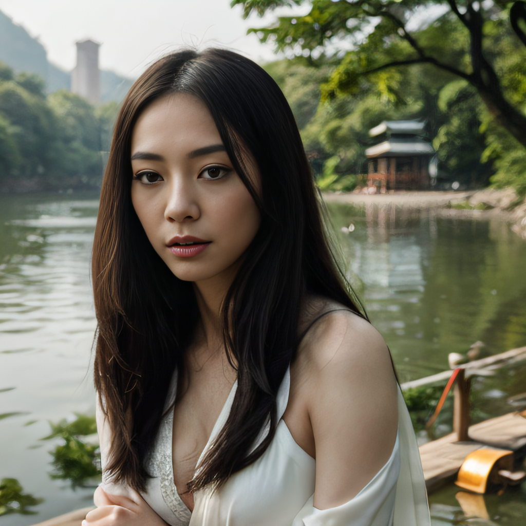 An alluring Chinese woman with long raven hair adorned with jade accessories gazes out upon the serene waters of West Lake in Hangzhou. Clad in elegant silk robes of emerald green and ivory white, she exudes grace and poise, symbolizing the harmony between nature and humanity found in ancient China. In order to render this ethereal scene, we propose consulting the renowned painter Zhang Daqian, whose style is reminiscent of traditional Chinese landscape painting techniques. perfect,master piece,highly detailed,photograph,absurdres,naked,sexy,30 years old,beautiful,closeup,