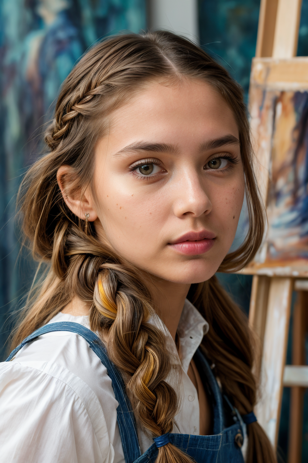 photorealistic, 1girl, full body, long braided hair, modeling, dynamic pose, artist in her atelier, detailed face,detaied skin,beautiful detailed eyes, detailed lip, workshop, paint, natural skin texture, (dynamic pose:0.3), petite, artist, detailed background, (busy background:1.2), colorful, messy,blue overalls
