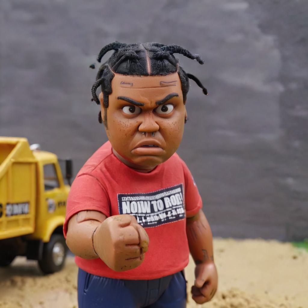 <lora:Clay Animation:1> clay, animation, claymation <lora:mkybrxl:1> mkybr, male focus, 1boy, dark-skinned male, small braids sticking out on head, photo background fat black man, with a dump truck behind him, truck has logo that says "trauma Dump"1man standing next to 1 man