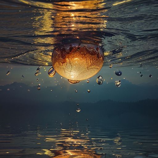 A camera lens sticking out of the Water, half angle, slightly from the side, warping of time and space, camera lens half way emerging from water, semi submerged rising through the water, with the most beautiful reflection of the colorful sunset, water droplets, refracting colorful light, color burst, explosion, fused, color bomb,