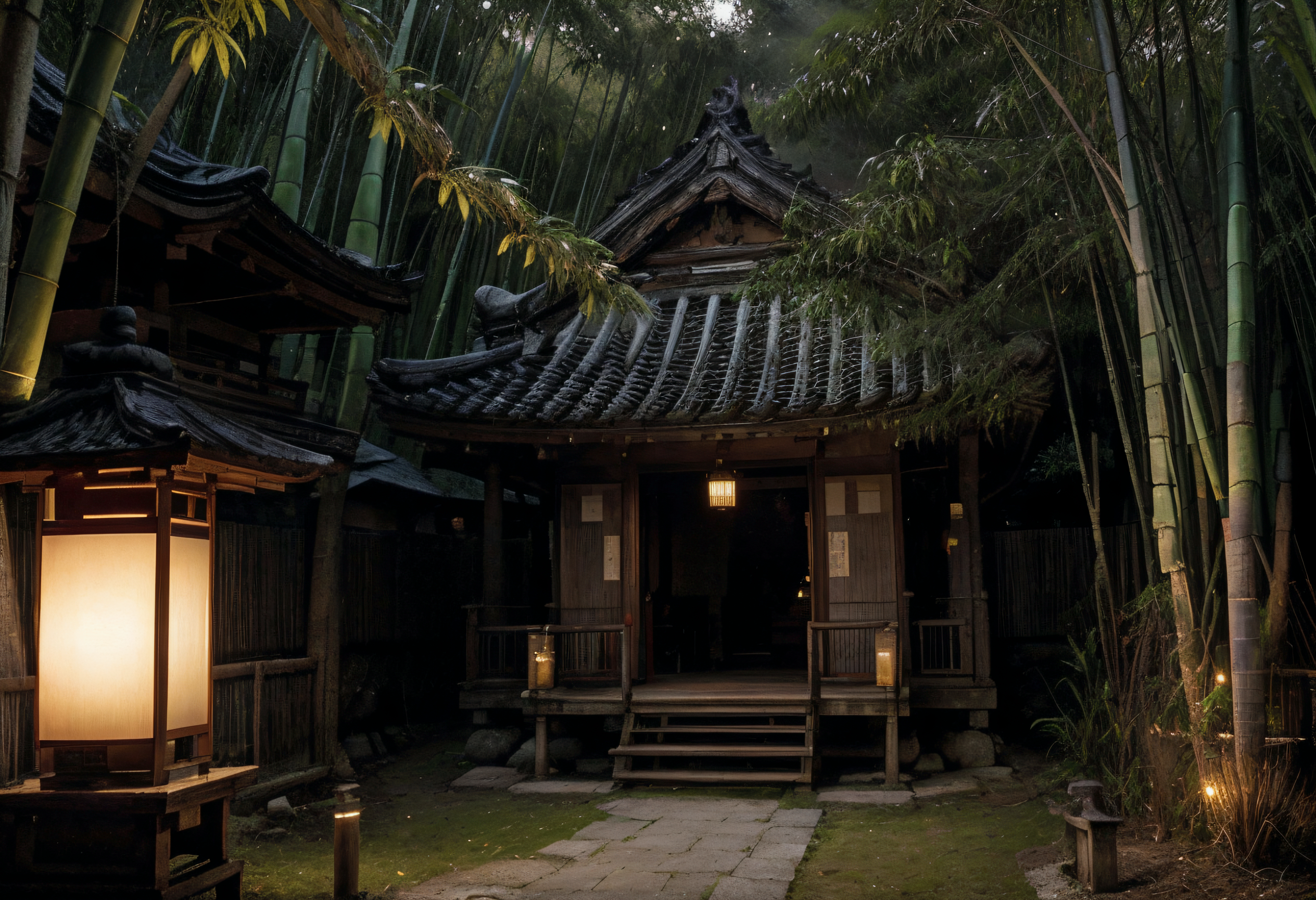 National Geographic photo of a remote Japanese-style tranquil temple in a misty bamboo forest. Midnight, with the scene lit by the light of colorful paper lanterns suspended high-up in the bamboo <lora:SD15 - epiCRealismHelper:0.8> <lora:SD15 - more_details:0.8>