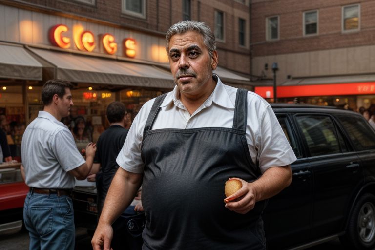 character Very obese george clooney with a hamburger in his hand