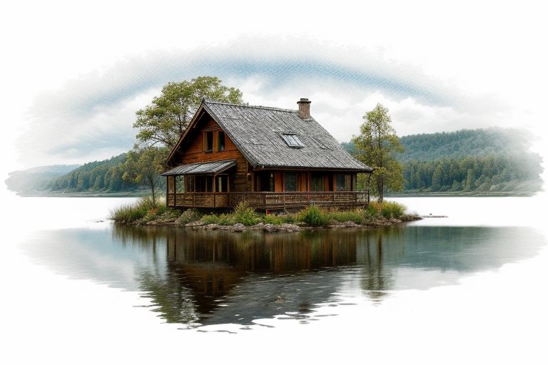 art Beautiful Lakeside Cabin in the Woods, isolated on white background, watercolor, high detail, HDR, self shadow, unique, intricate detail, hand - painted