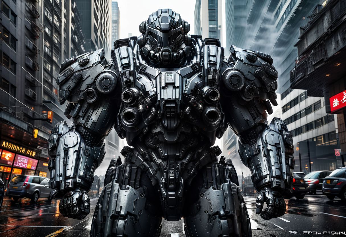 Power armor, holding gun, New York city street, destruction, cyberpunk, heavy bodyarmor, heavy bodyarmor, helmet, gray visor, mad-hvybdyarmr, dynamic pose, cinematic seen, dramatic lighting, (masterpiece:1.2), best quality, (hyperdetailed, highest detailed:1.2), high resolution textures