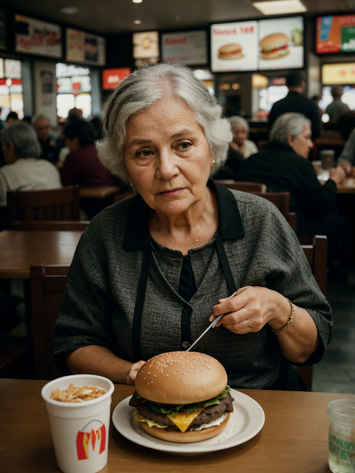 old woman in cafeteria, crowded burgers MacDonald's, intricate details, hdr, intricate details, hyperdetailed, cinematic, dark shot, muted colors, film grainy, soothing tones, muted colors, technicolor, (muddy:0.6)