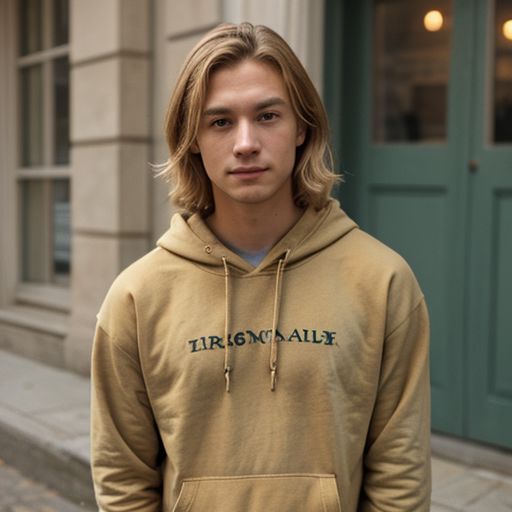 blonde hair man, friendly, eighteen, tan hoodie, green eyes