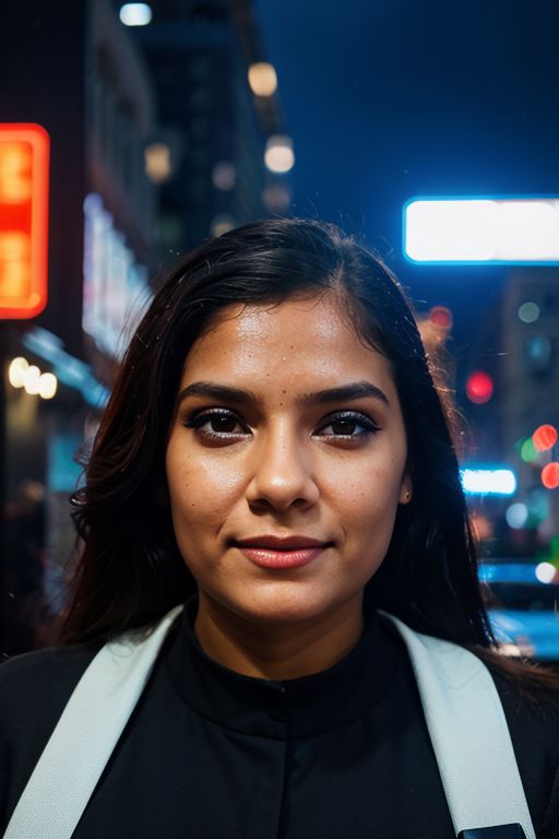 photo of mylocalgirl, detailed face and eyes, 1girl,((masterpiece)), closeup shot, ((best quality)),((high detail)),((realistic,)) Futurist era city, architectural streets, futuristic train lines, cyberpunk, buildings, night, European city, rainy, neon