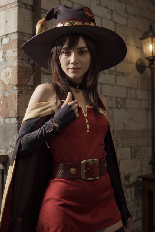 detailed face,beautiful face,(detailed eyes, deep eyes),1girl,((dynamic pose)), Megumin, brown hair, hat, witch hat, fingerless gloves, solo, gloves, cape, red eyes, dress, smile, belt, staff, short hair with long locks, short hair, looking at viewer, collar, red dress, black thighhighs, black gloves, thighhighs, holding, bandages, single thighhigh, bandaged leg, holding staff, brick wall, choker, asymmetrical legwear, long sleeves, black belt, cowboy shot, short dress