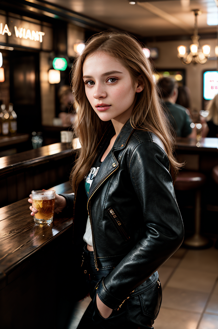 tv_Daria_MXAI, , , hard expression, wearing biker boots, wearing detailed leather pants, wearing a band t-shirt, wearing a leather jacket, standing at the bar in a biker bar, shot from the side,, 8k resolution, highres, high detail, sharp focus, detailed skin, 8k uhd, bokeh, analog photography