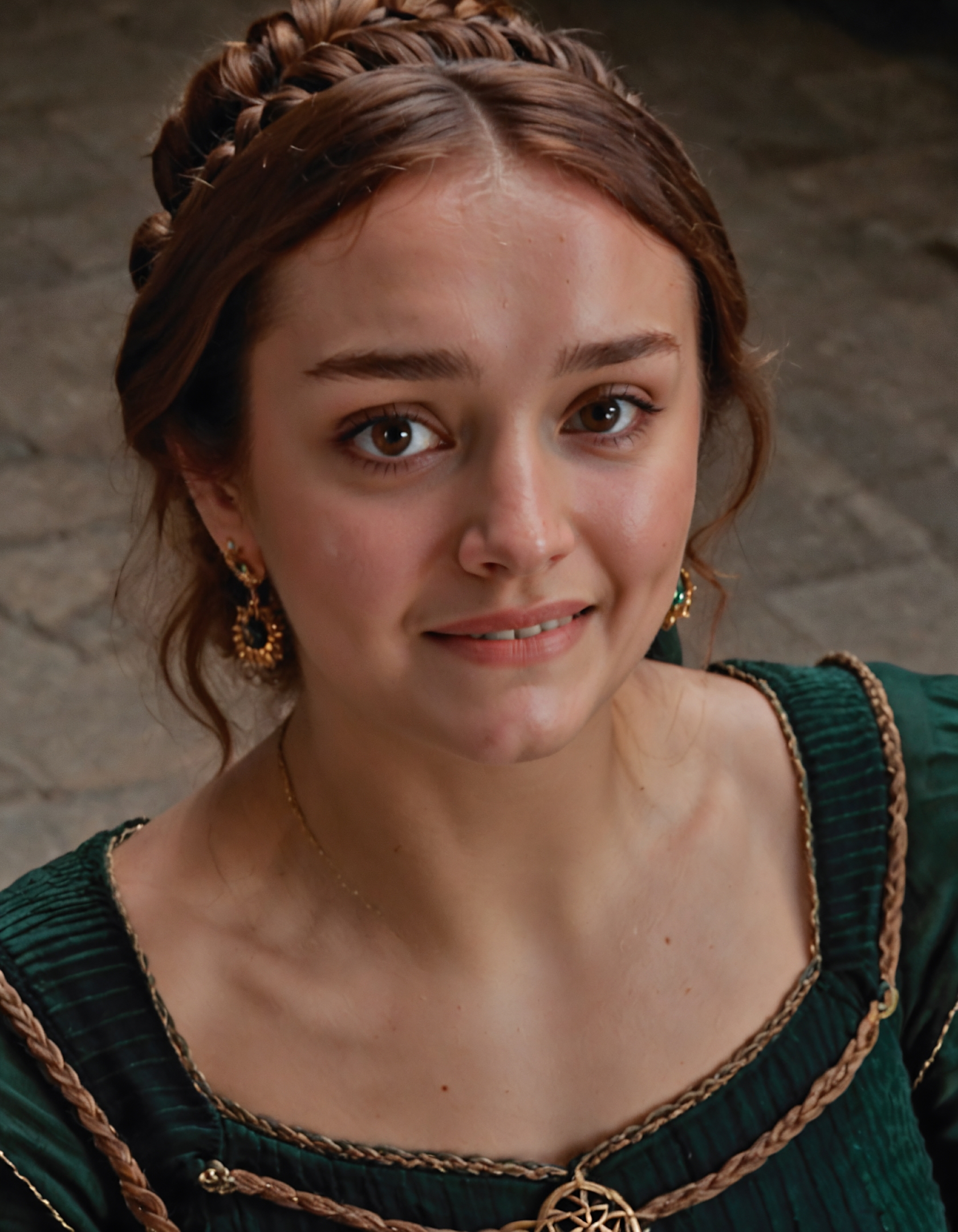 high resolution photo of alic3nt with brown hair and braided bun,high-angle shot,close-up,wearing green outfit,volumetric lighting,the shot is cinematic,(highly detailed skin:1.2),she is taking a selfie,(sweaty skin:1.2),she is smiling