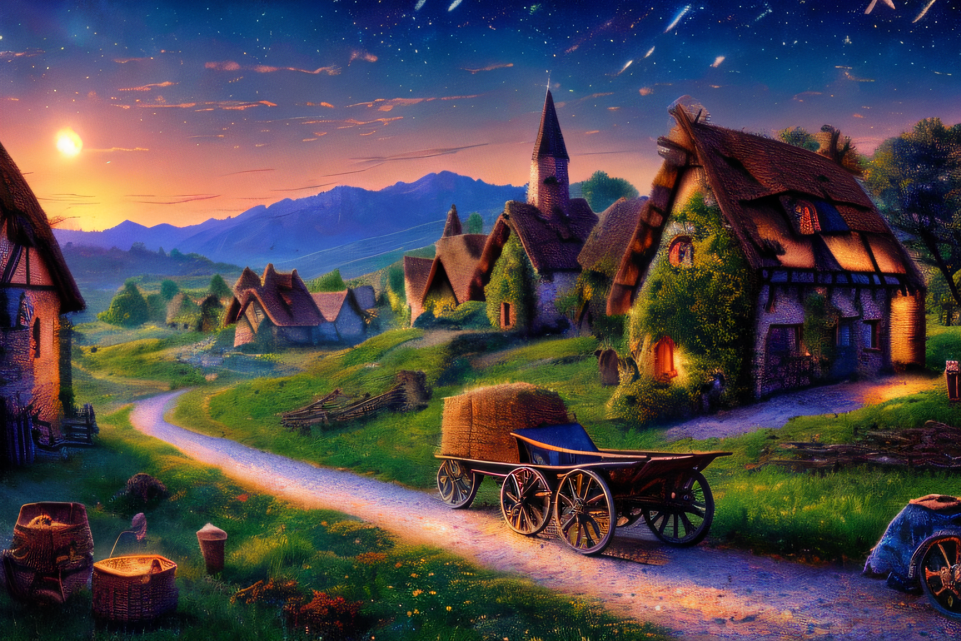 a wagon traveling through a village, <lora:FantasySettlement:1> fanse, church, warm lighting, night, nestled in a valley, (8k uhd), absurdres, highly detailed,