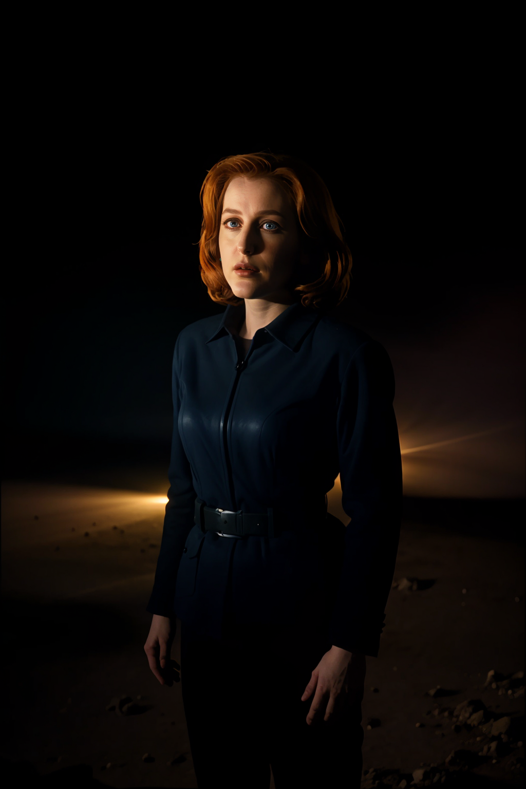 agentscully, standing in a strong and blinding light from a flying saucer, night, dark sky, dramatic light, from above, <lora:DanaScullySD_v2:1>
