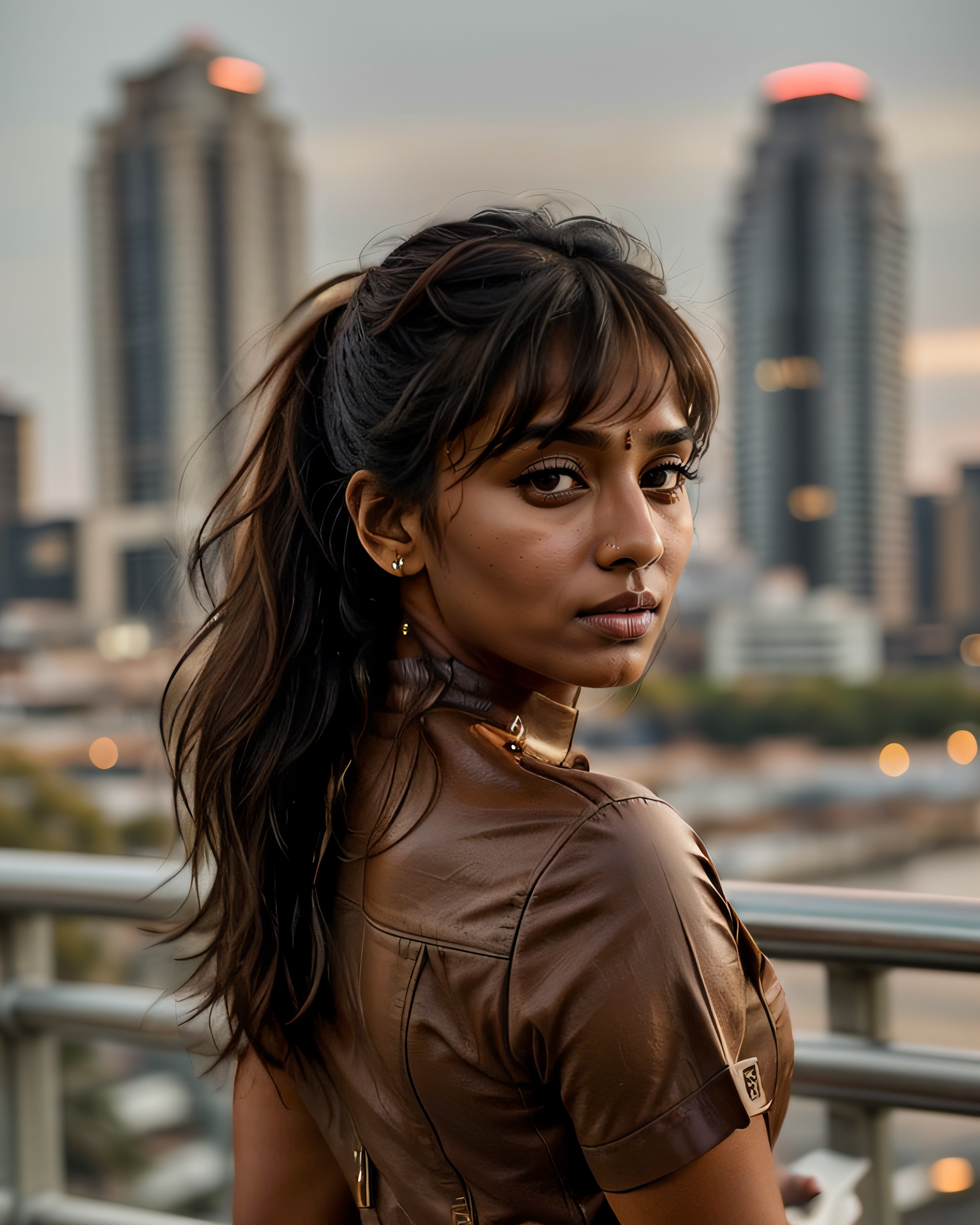 a photo of a pretty 30-year-old woman, desiespresso, professional portrait photo,Chin scratch of contemplation look on face, high neck Brown __desiespresso_clothes__, high ponytail and bangs, soft lighting, solo, night time, city bokeh lights <lora:Desi_Coffee_V3_SD15_LoRA_prodigy_local_regs:0.8>