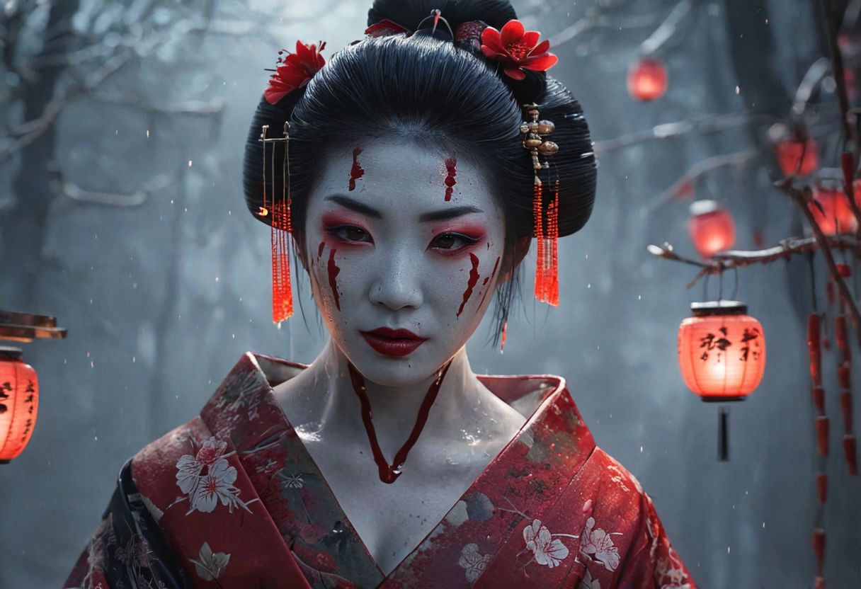 Geisha, ((beautiful)), Vampire, Ancient Japan, Portrait, Full body, Firefly lights, Tattoo, Spring, Frost, Foggy, High angle, Photorealistic, Cinematic, High quality, Ultra realistic, Hyper detailed, 4k, blood on face, bleeding, epic, blood dripping, bloodyface, blood, bleeding, (smile:0.4), Hyperrealism style