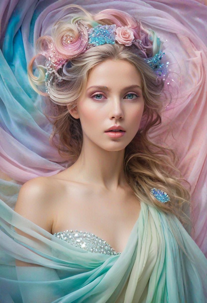 Abstract style hauntingly ethereal portrait of a mysterious figure draped in translucent fabric, crystals adorning their hair, amidst a dreamlike swirl of pastel hues and soft light, evoking a sense of calm serenity and elusive beauty, high detail, award winning masterpiece with incredible details . Non-representational, colors and shapes, expression of feelings, imaginative, highly detailed