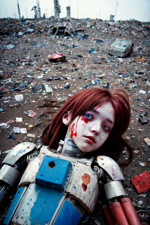 Photo of a broken ruined cyborg girl in a landfill, robot, body is broken with scares and holes,half the face is android,laying on the ground, creating a hyperpunk scene with desaturated dark red and blue details, colorful polaroid with vibrant colors, (vacations, high resolution:1.3), (small, selective focus, european film:1.2), art by Otomo Katsuhiro