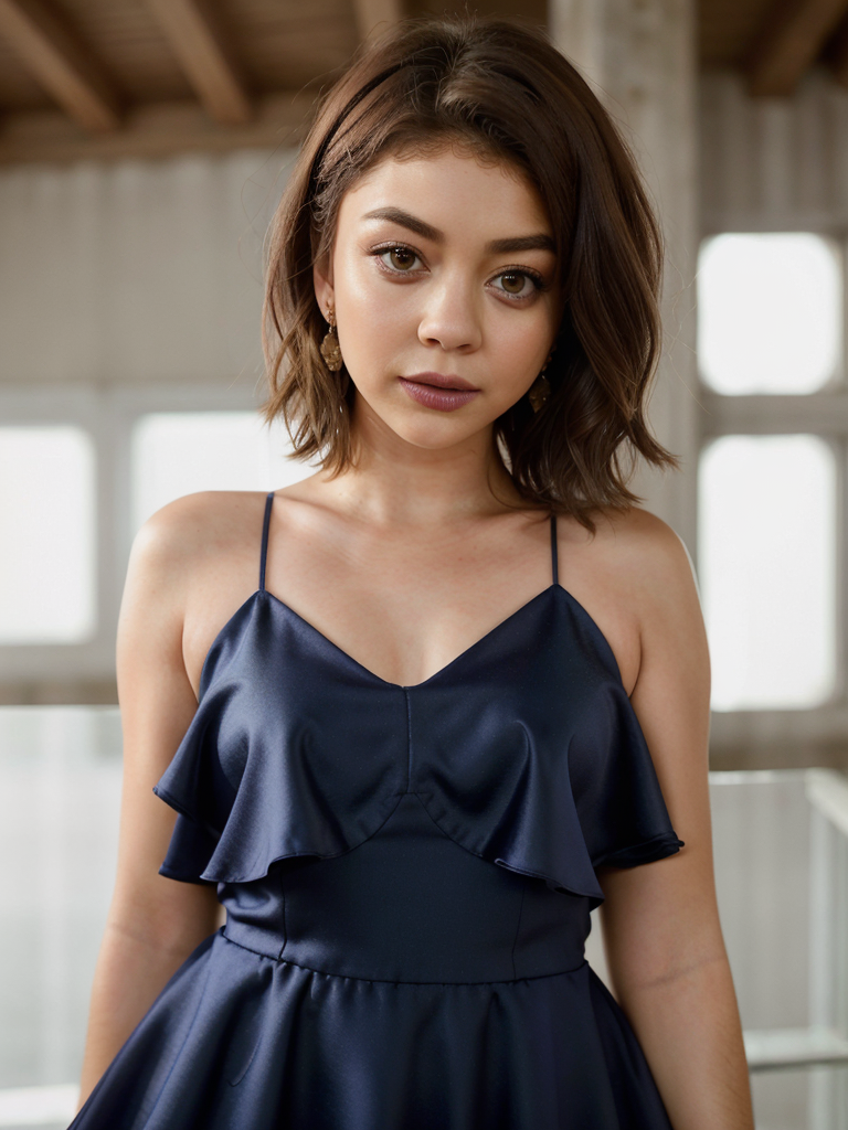 A beautiful s4r4hhy woman, 1girl,solo,short hair,looking at viewer,brown hair,dress,brown eyes,jewelry,earrings,lips,traditional media,realistic,soft lighting, professional Photography, Photorealistic, detailed, RAW, analog, sharp focus, 8k, HD, high quality, masterpiece<lora:s4r4hhy:1.0>
