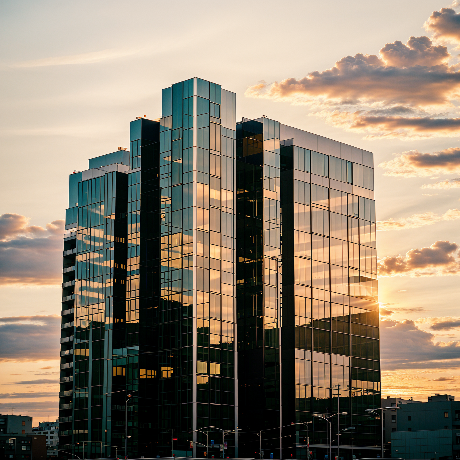 film photography style a smart building at sunset, a few clouds, light grain <lora:FILM_PHOTOGRAPHY_STYLE-000049:.6>