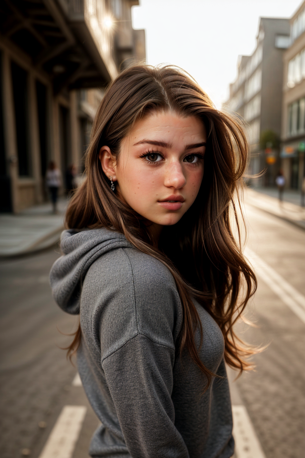 brooke_monk in a grey sweatshirt on a street, realistic, long flowing brown hair, harsh sunlight, morning, beautiful composition, sharp focus, high detailed face, smooth, digital illustration, symmetry, photorealistic portrait of a woman, closeup photo, dramatic lighting, cinematic scene, highly detailed, elegant, epic wide shot, smooth, intricate, elegant <lora:more_details:0.25>