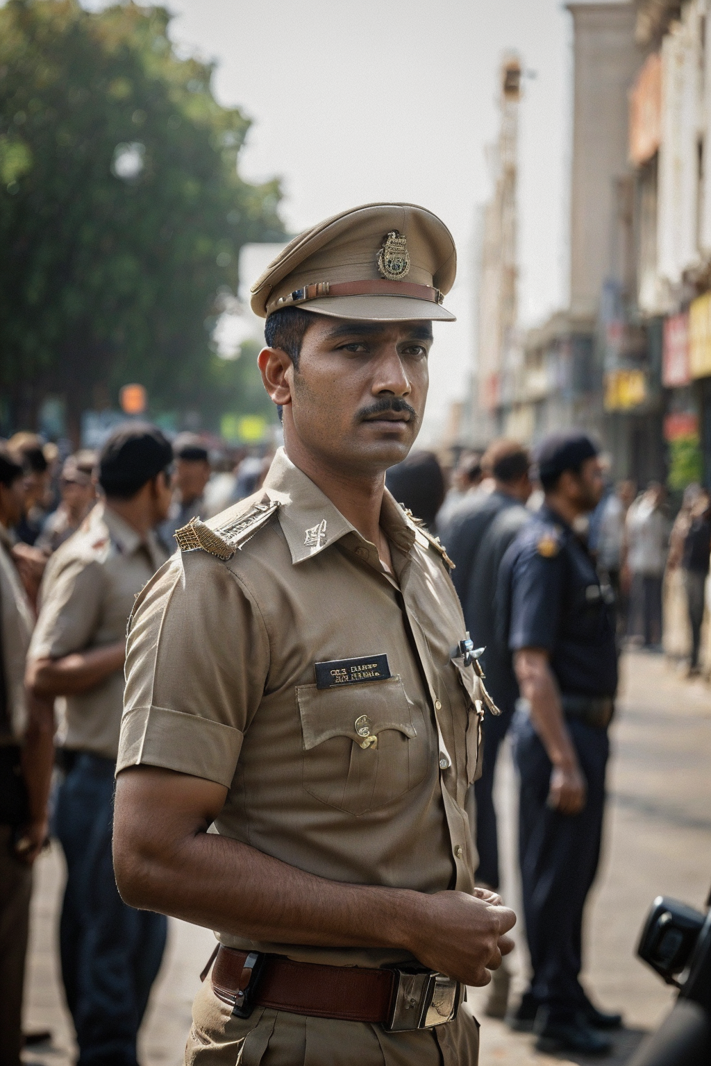 a stunning intricate full color photo of Indian man, as a police officer, in a khaki Indian police uniform, (Indian_Police_Uniform:1) <lyco:Indian_Police_Uniform_V1:1.25> on a busy Indian street, detailed skin, epic character composition, by ilya kuvshinov, alessio albi, nina masic, sharp focus, full focus, realistic light, subsurface scattering, f25, 35mm, film grain, analog style, epiCRealism