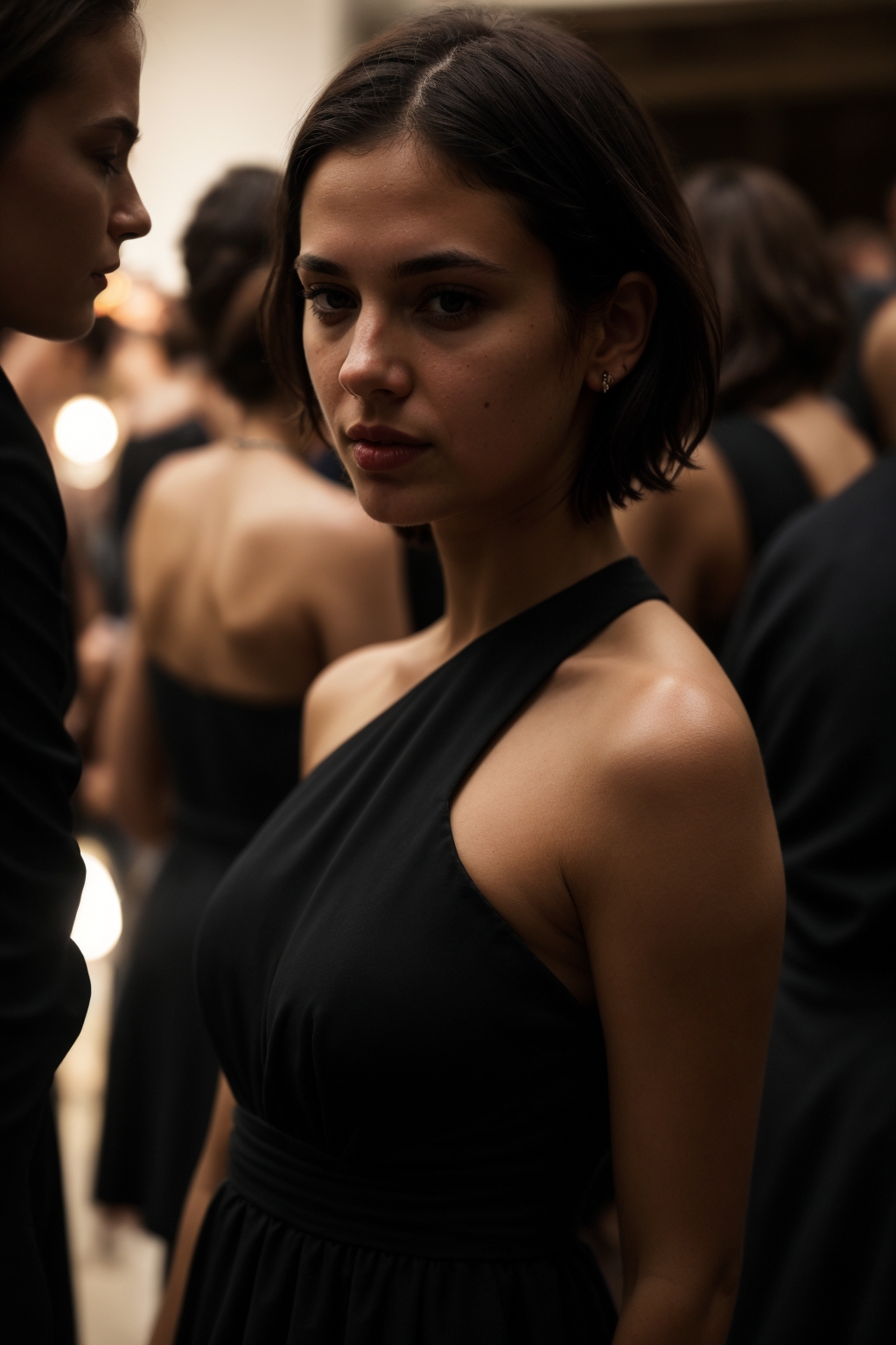 (High detail RAW Photo), DSLR BREAK, Full Body photo a 1woman, in a crowded party, sad face, short hair, wearing black long dress, open shoulder, close-up ( crowded:1.2) ((close up:0.7)), (masterpiece, extremely detailed skin, photorealistic, heavy shadow, dramatic and cinematic lighting, key light, fill light), sharp focus