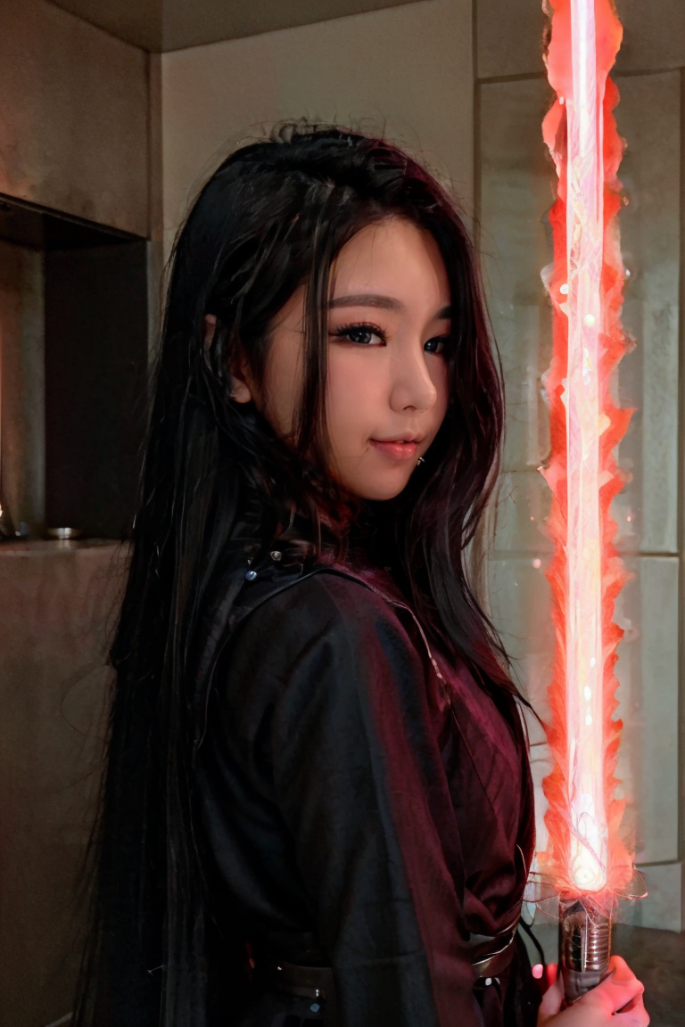 <lora:Lucyinthe_v4-10:0.8>, Lucyinthe, photo of a beautiful girl, looking at the camera, smile, woman dressed in sthoutfit, on lava, black hair, holding lightsaber <lora:sthoutfitV2:0.7>