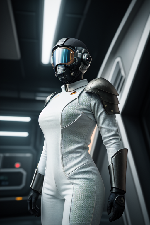 armed female figure in a white sci-fi suit (tight jumpsuit), at the spaceport, against the background of a sci-fi ship taking off, overcast, mask, sci-fi visor, sci-fi lens, sci-fi respirator, bald head, plate armor, isolated armor, third-person view from below, lots of fine detail, sci-fi movie style, photography, natural textures, natural light, natural blur, photorealism, cinematic rendering, ray tracing, highest quality, highest detail, Cinematic, Blur Effect, Long Exposure, 8K, Ultra-HD, Natural Lighting, Moody Lighting, Cinematic Lighting hyper-realistic, vibrant, 8k, detailed, ultra detail