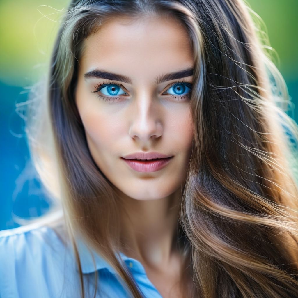 a woman with natural long hair , eyes blue , beautifull face portrait
