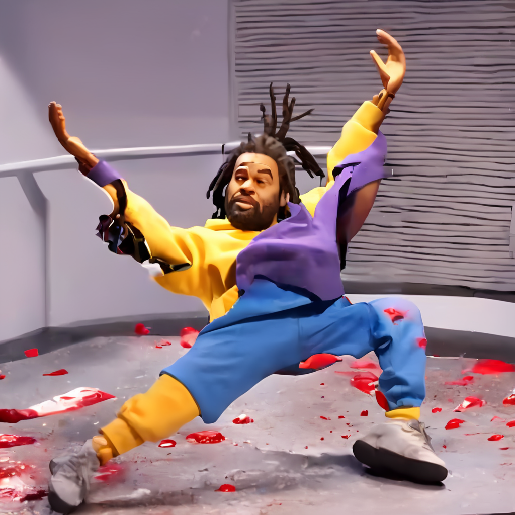 a photo of a cinematic still of rhwrld , dreads in a bun, in the style of rbtchkn <lora:riiahworldxl:1> rhwrld <lora:jcoleXL:0.9> robot chicken, rbtchkn, robot chicken tv show, stop motion, depth of field , close up, wearing a yellow hoodie, wearing blue joggers, bleeding out of his shirt, bleedin, in a space ship