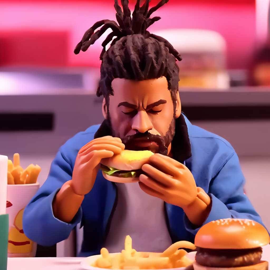 a cinematic still of ,rbtchkn style ,rhwrld , dreads in a bun in the style of rbtchkn <lora:riiahworldxl:1> rhwrld, depth of field , at a resturaunt eating a burger,<lora:jcoleXL:0.7> robot chicken, rbtchkn, robot chicken tv show, stop motion